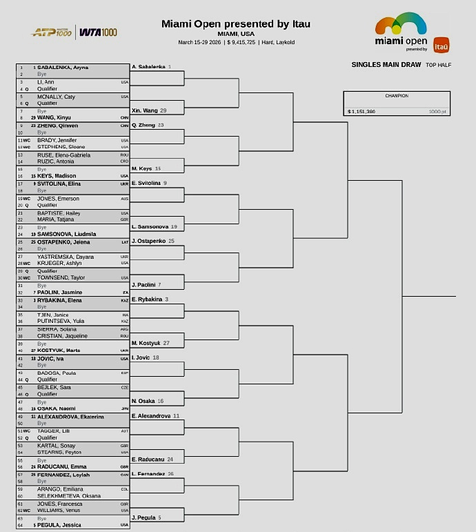 而WTA1000迈阿密站的单打签表已经出炉,前八大种子的对位:上半区,萨巴伦卡--鲍里妮、莱巴金娜--佩古拉;下半区,阿尼西莫娃--高芙、米拉-安德列娃--斯瓦泰克。上届八强、中国一姐郑钦文位列第23号种子,首轮轮空,次轮将对阵美国人布雷迪或斯蒂芬斯,第三轮的潜在对手是美国名将凯斯或刚刚赢过她的克罗地亚人鲁季奇,第四轮将对位世界第一萨巴伦卡,签表很硬,保分压力很大。
